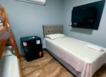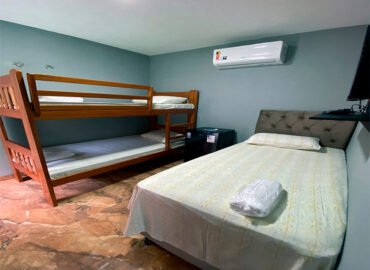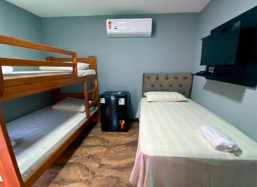 Nosso quarto triplo é a escolha perfeita para famílias ou grupos de amigos que procuram espaço e privacidade. O quarto triplo oferece uma configuração confortável e funcional, equipado com uma cama de solteiro e um beliche para acomodar até três pessoas. Complementado por amenidades modernas, como frigobar, tv smart e ar condicionado, garantindo uma estadia produtiva e relaxante.